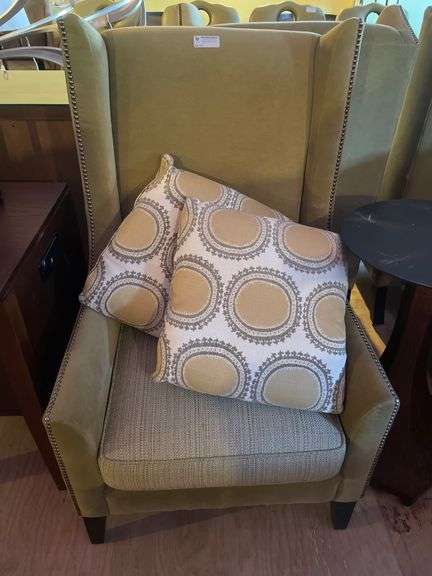 LOT 125 - ARMED GREEN STUDDED READING CHAIR W/2 PILLOWS